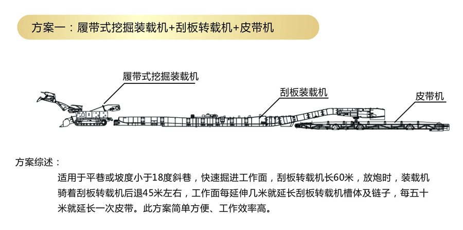 方案一:履帶式挖掘裝載機+滑板轉(zhuǎn)載機+皮帶機